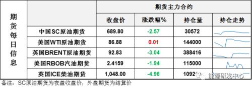 【1】WTI主力原油期货较上周五收涨0.01美元,涨幅0.01%,报86.88美元/桶;布伦特主力原油期货收跌2.91美元,跌幅3.04%,报92.83美元/桶;INE原油期货收跌2.57%,报689.8元。