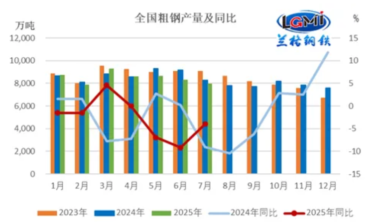 8月份,由于重大事件区域限产的影响,传统旺季前的备货效应不及预期,而终端需求也呈现明显的分化特征,制造用钢需求明显好于建筑用钢需求,预计8月份国内钢铁产量或将继续下降。据兰格钢铁研究中心估算,8月份全国粗钢日产或将维持在250万吨左右。9月份来看,月初限产政策仍有延续,后期“反内卷”及行业自律要求,预计粗钢日产仍将维持低位。