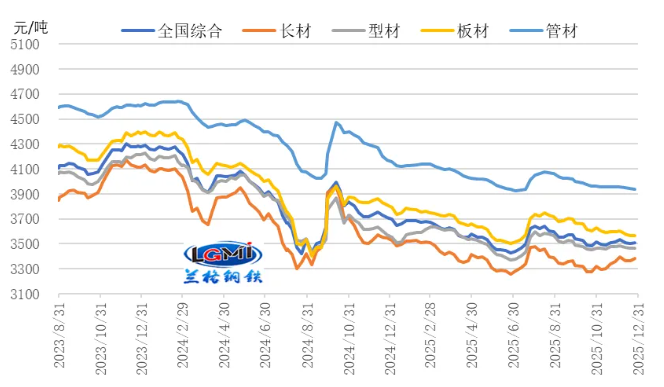 2025年12月份,在全球经济恢复态势相对平稳、我国经济指标继续下滑、供给释放力度仍然分化、市场需求进入淡季、成本支撑维持韧性的影响下,国内钢铁市场呈现了区间震荡运行的行情。据兰格钢铁网监测数据显示,截至12月底,兰格钢铁全国钢材综合价格为3509元/吨,较上月底下跌4元/吨,环比跌幅0.1%,年同比下跌5.3%。从月度均值来看,12月份,兰格钢铁全国钢材综合价格均值为3515元/吨,较上月上涨15元/吨,涨幅为0.4%。