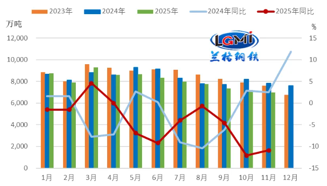 尽管2025年以来房地产政策持续释放,但从1-11月数据来看,房地产行业与用钢需求相关的核心指标如投资与施工端均呈同比下降态势,对建筑用钢(螺纹钢、线材等)需求形成持续压制;而在地产销售与资金端,需求回暖信号微弱,进一步限制其复工复产和新开工意愿,短期难以形成用钢需求的有效增量,制约用钢需求修复。