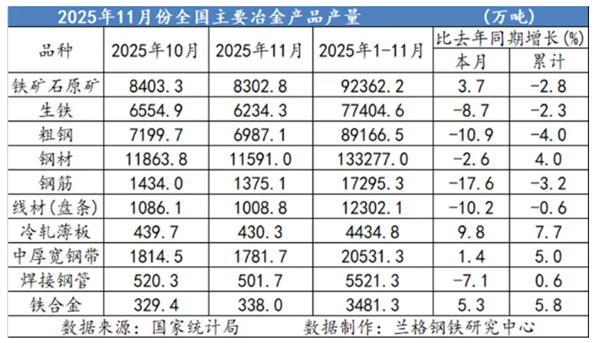 表1 2025年1-11月份钢铁行业产品产量及增长情况