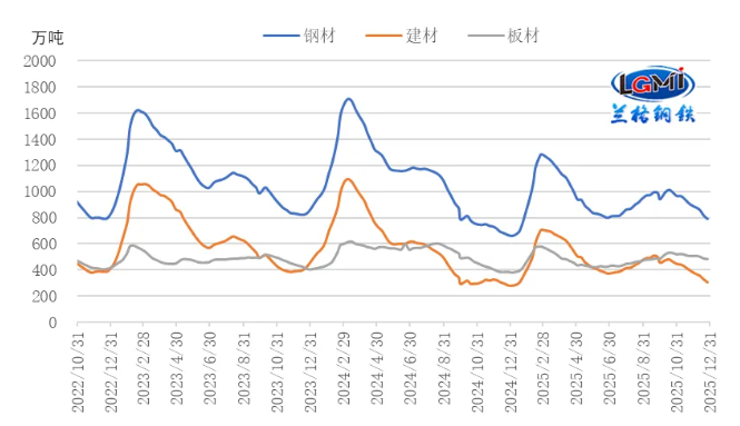 2025年12月份,钢材社会库存呈现逐步下降态势。据兰格钢铁网监测数据显示,截至12月底,兰格钢铁网统计的29个重点城市钢材社会库存为789.4万吨,月环比下降11.5%,年同比增长19.0%。其中,建材社会库存为305.4万吨,月环比下降20.6%,年同比增长9.0%;板材社会库存为484.1万吨,月环比下降4.5%,年同比增长26.3%(详见图3)。2026年1月份市场随着淡季深入及春节逐步临近,预计钢材社会库存或将呈现逐步回升态势。