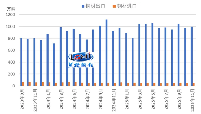 当前,我国钢铁企业出口订单指数再回收缩区间,全球制造业指数也呈现小幅下降态势;受外部环境复杂多变影响,制造业外需景气度虽有所企稳但仍处于偏弱状态;同时,全球粗钢产量持续恢复,叠加贸易摩擦及相关税费政策的制约,继续对我国钢材出口形成抑制;但在我国钢材出口价格竞争力仍存,以及“一带一路”战略下钢材出口多元化渠道带动,为规避2026年起出口管理限制短期抢出口效应有所呈现,预计2025年12月我国钢材出口或保持在900-1000万吨的水平;就全年来看,2025年我国钢材出口有望达到1.17亿吨,同比增长6%左右。2026年1月1日起我国实施的钢铁出口许可证新政与欧盟碳边境调整机制CBAM正式生效,将对2026年我国钢材出口形成一定抑制。