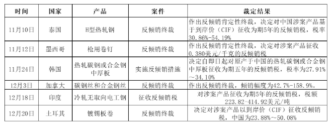 11月下旬以来,钢铁行业贸易救济调查发起案件继续。11月25日,澳大利亚对涉华焊接钢丝网片发起反倾销调查;11月28日,韩国对华镀锌冷轧钢启动反倾销调查;12月11日,欧盟对华硅锰钢丝发起反倾销调查;12月17日,南非对华彩涂板发起反倾销调查。前期反倾销裁定也在陆续出台(详见表2),相关税率的实施将继续制约我国相关钢材产品出口。